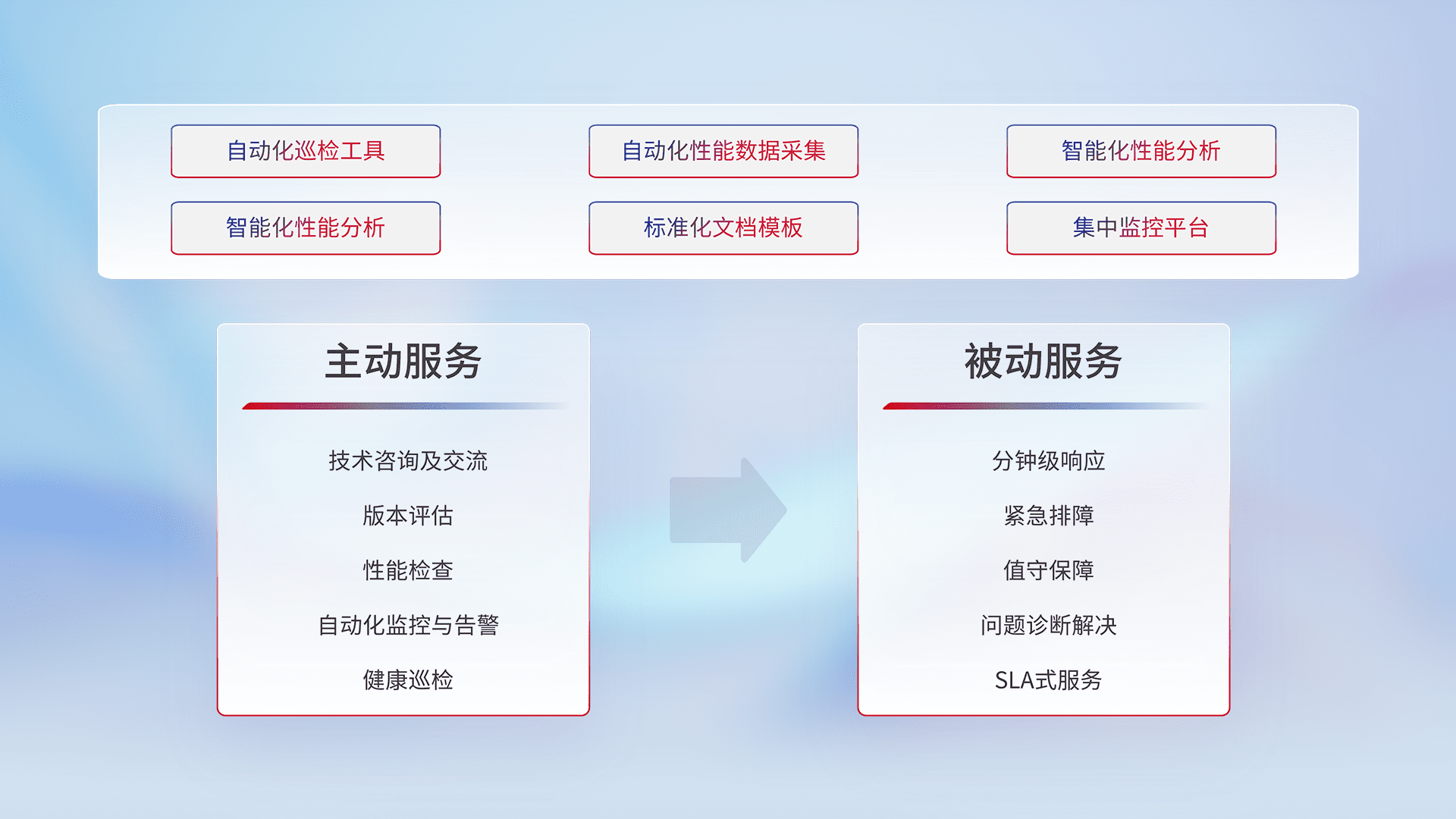 智能化工具和标准化文档,,,保障服务质量,,,,提供主动服务(包含技术咨询、、、版本评估、、、、性能检查、、自动化监控与告警、、健康巡检)和被动服务包含(分钟级响应、、、、紧急排障、、、值守保障、、、、问题诊断解决、、SLA服务)。。。。